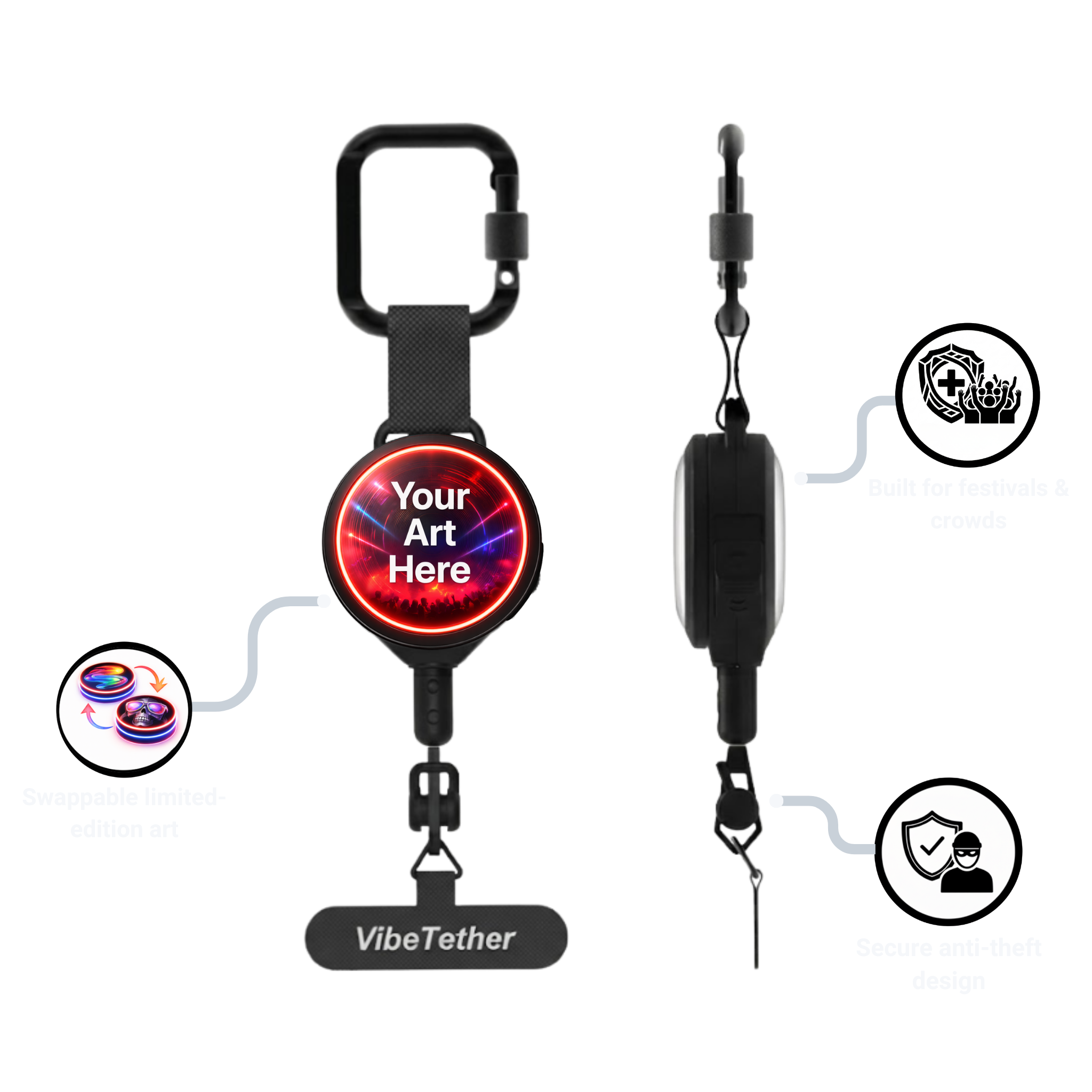 Vibe Tether is a modular, secure accessory built for festivals and high-energy crowds. Our interchangeable art system transforms original digital designs into limited-edition, real-world collectibles, worn, seen, and experienced beyond the screen.